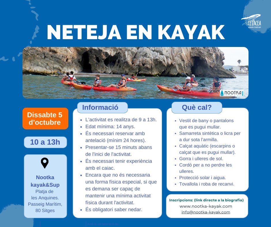 • Neteja en Kayak: Dissabte 5, de 10 a 13h amb @nootkakayaksup. . Inscripcions a: info@nootka-kaya.com. Activitat gratuïta. Edat mínima 14 anys.