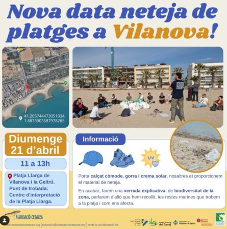Aquest proper diumenge dia 21 d’abril ens podreu trobar a la Platja Llarga de Vilanova i la Geltrú, de 11h a 13h. Quedarem al costat del Centre d’interpretació i ens dedicarem a recollir tants residus com puguem! Ens acompanyes?