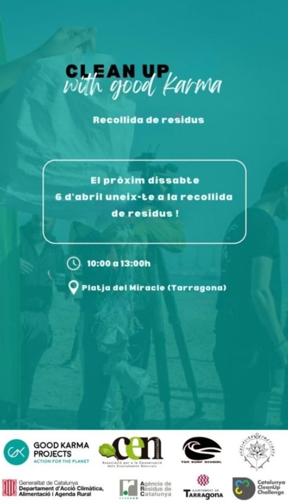 Aquest dissabte 6 d’abril vine a la platja del Miracle de Tarragona a una activitat de recollida de residus, que organitzem conjuntament l’Associació Cen, Good Karma Projects, Associació CLTV i Tarragona Surf School.