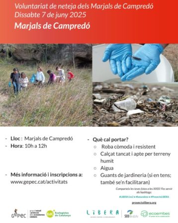 Uneix-te a la jornada de voluntariat del projecte Libera per fer front a la basuraleza (residus en entorns naturals) i posar en valor les marjals de Campredó, un espai d’alt valor ecològic.