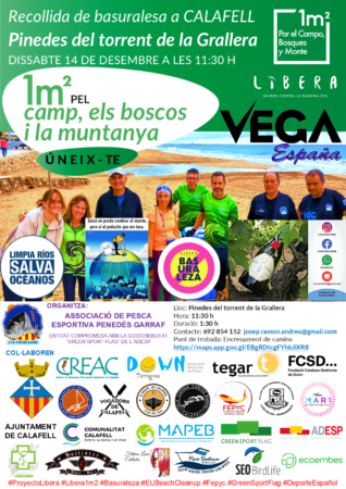 Recollida de residus abandonats a les pinedes del torrent de la Grallera dins de la campanya 1m2 pel camp, boscos i muntanya del projecte LIBERA de SEO-Birdlife i Ecoembes, organitzada per l’Associació de pesca esportiva Penedès Garraf en col·laboració amb cada dia més entitats socials i esportives amb voluntat d’implicar-se en la conservació de l’entorn natural de Calafell.