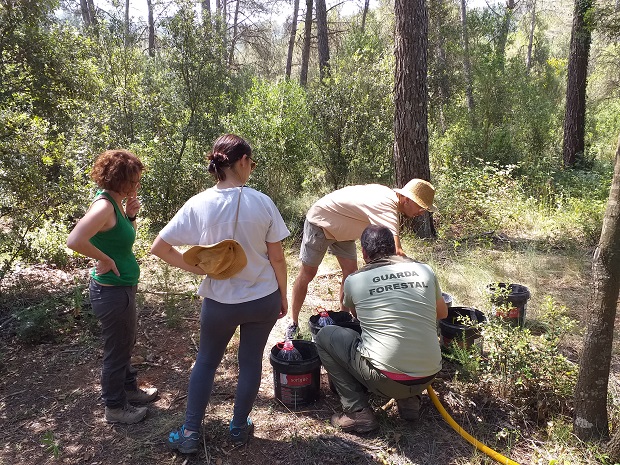 Objectiu i activitats de la jornada: L’objectiu de la jornada és regar una plantació de 122 pins realitzada al febrer d’aquest any. Per arribar a la zona on hi ha els arbres cal realitzar un itinerari de 1,5 h. aproximadament de duració. El camí és accessible, encara que no està habilitat per a persones amb mobilitat reduïda. El nivell d’esforç per realitzar-lo és sota-mitjà. Els arbres es troben molt pròxims entre si i en zona plana. El reg s’efectuarà amb garrafes o galledes, de manera que el nivell d’esforç del treball a realitzar és Baix.