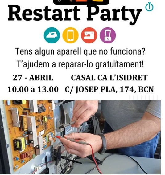 Una Restart Party és un esdeveniment públic en el qual voluntaris amb habilitats tècniques ajuden als assistents a aprendre a reparar els seus aparells espatllats. L’ambient és relaxat, de manera que les persones que esperen a ser ateses poden prendre alguna cosa.
