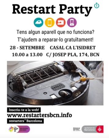 Una Restart Party és un esdeveniment públic en el qual voluntaris amb habilitats tècniques ajuden als assistents a aprendre a reparar els seus aparells espatllats. L’ambient és relaxat, de manera que les persones que esperen a ser ateses poden prendre alguna cosa.