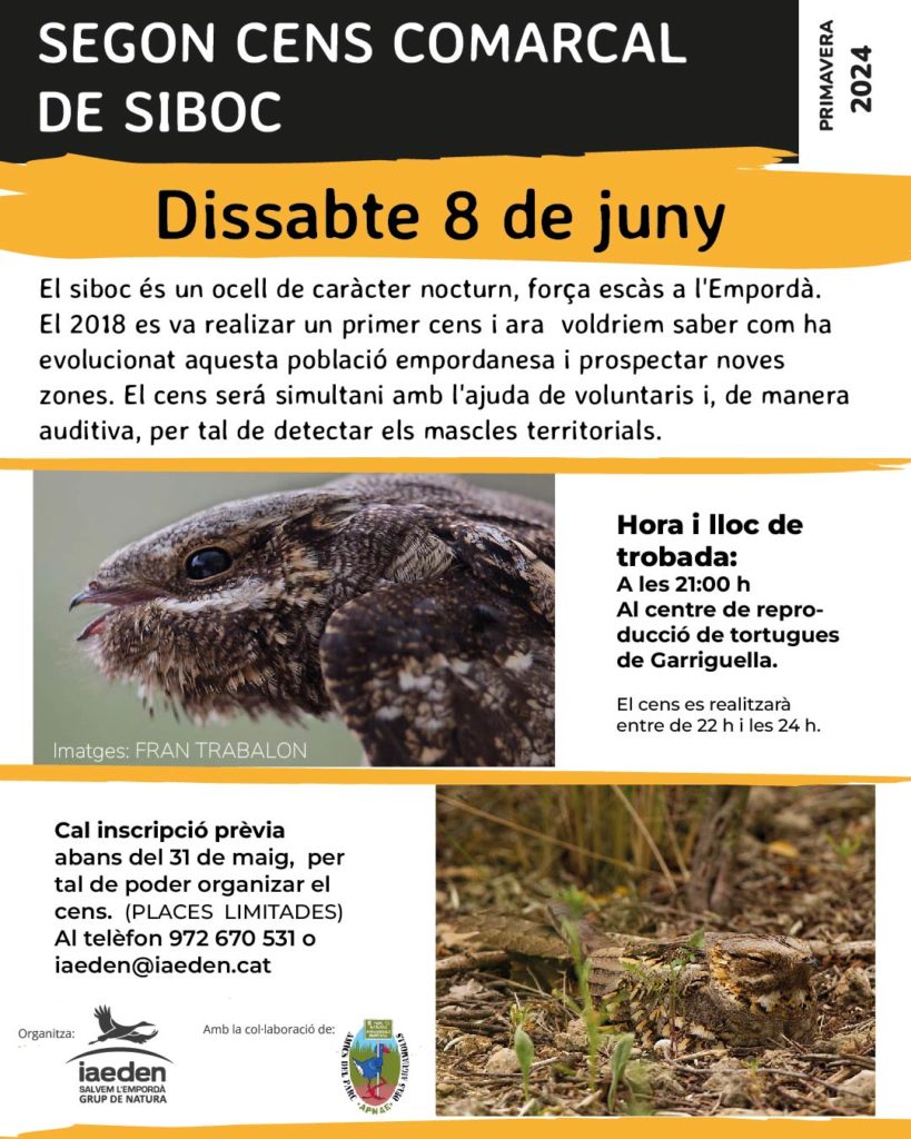 El siboc és una es ocell de caràcter nocturn, força escàs a la comarca, per tal de conèixer més a fons la població que hi ha a l’Empordà, es vol realitzar un cens simultani amb l’ajuda de voluntaris per tal de detectar les possibles parelles que hi ha a l’Empordà., l’any 2018 ja es va realitzar un i ara es tornarà a repetir.  El cens es realitzarà de nit entre les 22 i les 24 h.