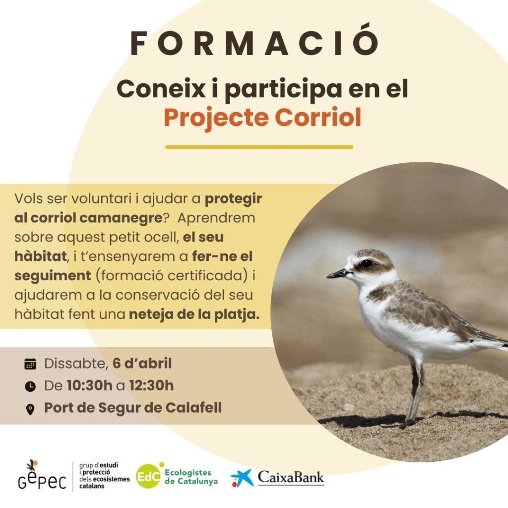 Aquest mes de març el GEPEC-EdC inicia la seva campanya anual del projecte de conservació del corriol camanegre en la qual farà el seguiment d’aquesta espècie a diferents municipis del Garraf, el Baix Penedès i el Tarragonès gràcies a l’ajuda econòmica de CaixaBank. Per fer aquest seguiment comptarà amb la participació d’un gran nombre de persones que de forma voluntària recorreran les platges per identificar els exemplars d’aquesta espècie i registrar l’evolució de la seva supervivència durant el període de reproducció comprès entre el mes de març i el mes d’agost.