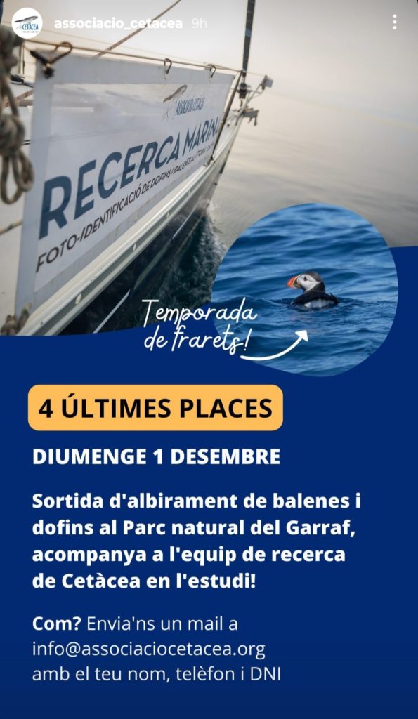 La sortida consisteix en una dia de navegació acompanyant membres de l’associació en els projectes Foto-Identificació: Balenes i dofins del litoral català i Plomes al Mar (concretament a la zona del Garraf). Es tracta, per tant, d’acompanyar-nos durant una jornada d’estudi i col·laborar d’aquesta forma en el finançament del projecte.