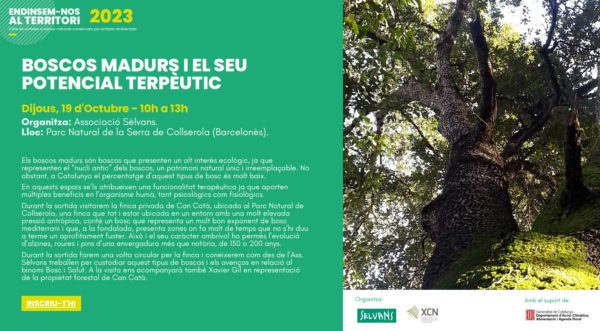 Durant la sortida visitarem la finca privada de Can Catà, ubicada al Parc Natural de Collserola, una finca que tot i estar ubicada en un entorn amb una molt elevada pressió antròpica, conté un bosc que representa un molt bon exponent de bosc mediterrani i que, a la fondalada, presenta zones on fa molt de temps que no s’hi duu a terme aprofitament fuster. Això i el seu caràcter ombrívol ha permès l’evolució d’alzines, roues i pins d’una envergadura més que notòria, de 150 o 200 anys. Durant la sortida farem una volta circular per la finca i coneixerem com des d e l’A s s. Sèlvans treballen per custodiar aquest tipus de boscos i els avenços en relació al binomi Bosc i Salut. A la visita ens acompanyarà també Xavier Gil en representació de la propietat forestal de Can Catà.