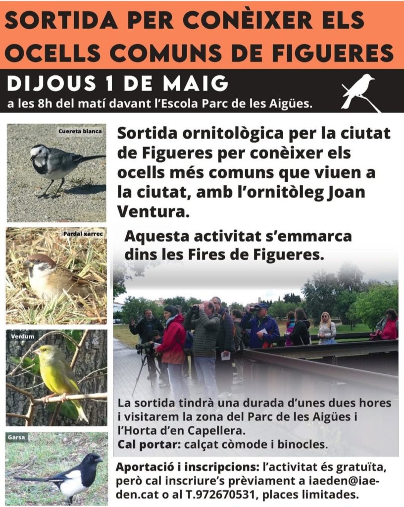 Sortida ornitològica per la ciutat de Figueres i rodalies per conèixer els ocells més comuns que viuen a la ciutat, amb l’ornitòleg Joan Ventura. Aquesta activitat s’emmarca dins les Fires de Figueres.