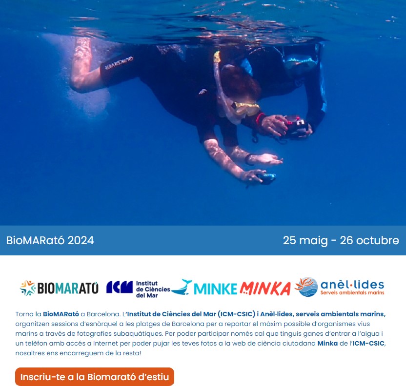 Torna la BioMARató a Barcelona. L‘Institut de Ciències del Mar (ICM-CSIC) i Anèl·lides, serveis ambientals marins, organitzen sessions d’esnòrquel a les platges de Barcelona per a reportar el màxim possible d’organismes vius marins a través de fotografies subaquàtiques.