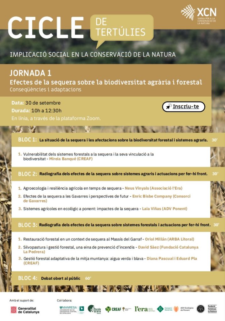 Aquest cicle de tertúlies ofereix una plataforma per comprendre millor els reptes que la sequera presenta per a la biodiversitat i explorar solucions pràctiques per a la seva conservació. Us animem a participar i compartir les vostres idees i experiències!