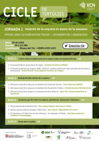 Molt s’ha parlat últimament de la sequera. En aquesta sessió aprofundirem en quina és la perspectiva de les entitats ambientals en les zones fluvials que restauren des de fa anys i quina és la seva perspectiva de futur. La primera tertúlia, programada pel 10 de juliol al Museu del Ter – CERM-UVIC-UCC, abordarà l’impacte de la sequera sobre els sistemes fluvials.