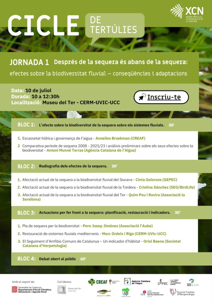 Es presentarà una panoràmica sobre les conseqüències de la falta d’aigua en la biodiversitat fluvial, incloent-hi una comparativa dels períodes de sequera de 2008 a 2021/23. També es farà una anàlisi dels efectes actuals en rius com el Siurana, la Tordera i el Ter, des de la perspectiva de diverses entitats.
