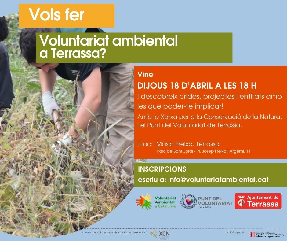 Vine a conèixer crides i iniciatives per fer voluntariat ambiental a la Masia Freixa de Terrassa, a la xerrada de la Xarxa per a la Conservació de la Natura i el Punt de Voluntariat de Terrassa.