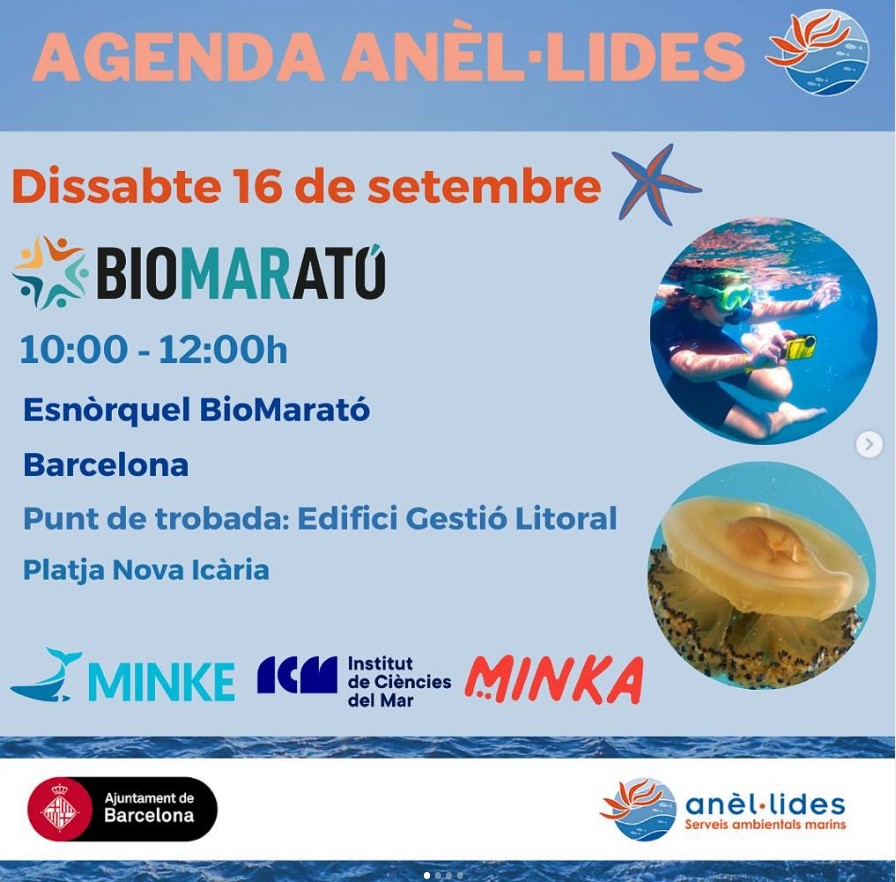 Participa en la BioMARató a Barcelona. L‘Institut de Ciències del Mar (ICM-CSIC) i Anèl·lides organitzen sessions d’esnòrquel a les platges de Barcelona per a reportar el màxim possible d’organismes vius marins a través de fotografies subaquàtiques. Per poder participar només cal que tinguis ganes d’entrar a l’aigua i un telèfon amb accès a Internet per poder pujar les teves fotos a la web de ciència ciutadana Minka de l’ICM-CSIC, nosaltres ens encarreguem de la resta!