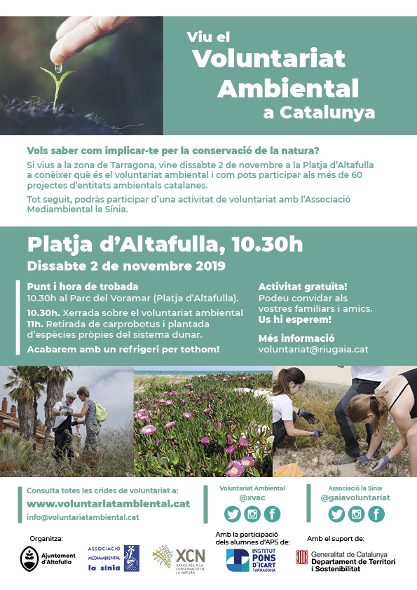 L’Associació Mediambiental la Sínia i l’Ajuntament d’Altafulla organitzen una jornada de voluntariat, la 8 edició del Viu la platja! a la platja d’Altafulla.
