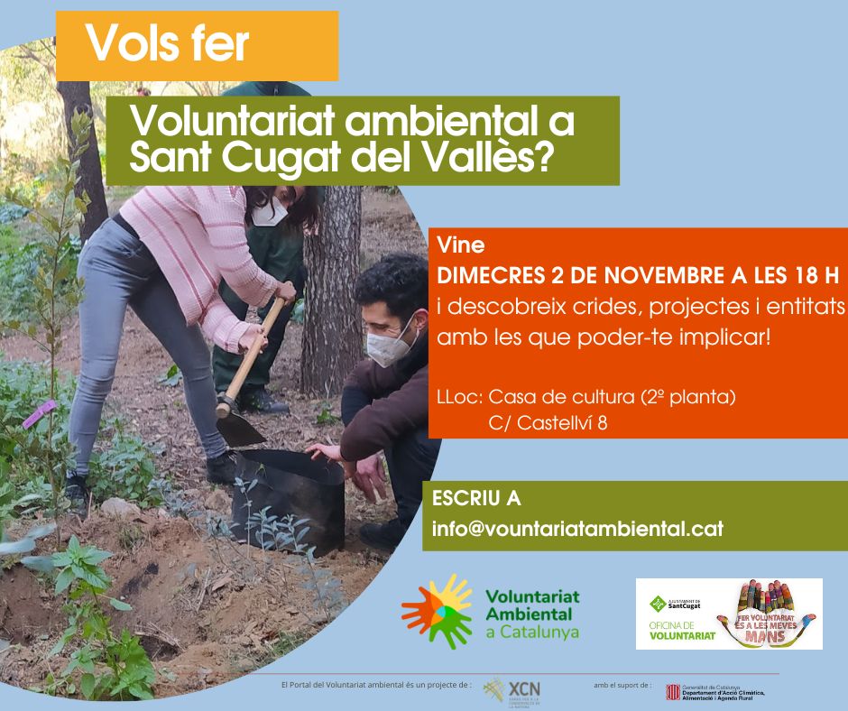Vine a conèixer crides i iniciatives per fer voluntariat ambiental a l’àrea de Sant Cugat del Vallès, a la xerrada a l’Oficina de Voluntariat de Sant Cugat dimecres 2 de novembre a les 18 h.