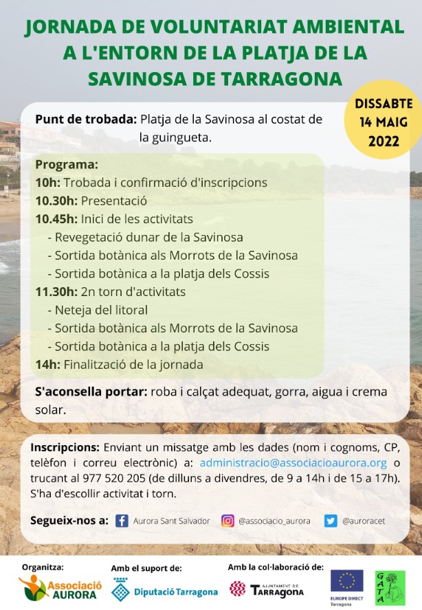 El proper dissabte 14 de maig l’Associació Aurora realitzarà una jornada de voluntariat ambiental a l’entorn de la platja de la Savinosa amb diferents activitats per recuperar i donar a conèixer aquest entorn natural. . Es revegetaran les dunes de la Savinosa, es netejarà un tram de litoral, i es faran sortides botàniques i de descoberta de l’espai. ?