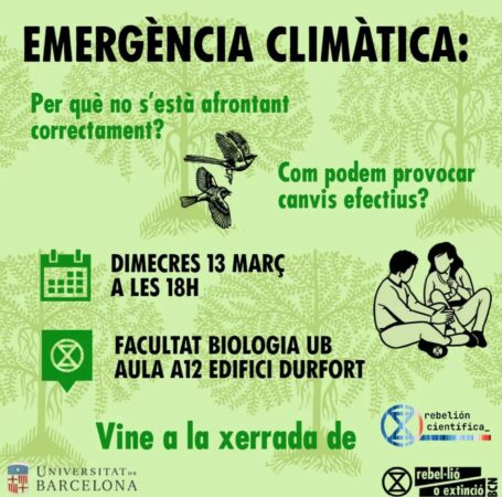 Et preocupa l'emergència climàtica? Tens nocions de què és però t'agradaria saber-ne més? Voldries incidir en solucions efectives? Xerrada amb temps per comentaris del públic.  La ciutadania té una gran oportunitat en les decisions per reduir i mitigar les conseqüències de l'emergència climàtica. Dimecres 13 de Març a les 18h a la Facultat de biologia UB, aula A12 edifici Durfort