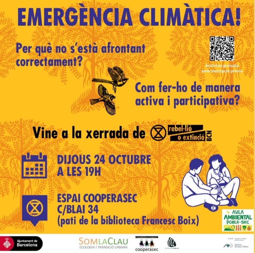 Dijous 24 d’octubre us esperem a la xerrada “Emergència climàtica: com podem provocar canvis efectius?” a càrrec de Extinció o Rebellió Barcelona, grup barceloni? del moviment internacional Extinction Rebellion