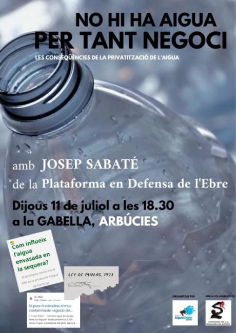 Des del col·lectiu AiguaClara ens conviden a gaudir i participar de la xerrada "NO HI HA AIGUA PER TANT NEGOCI", a càrrec de Josep Sabaté, integrant de la Plataforma en Defensa de l'Ebre, al Museu La Gabella el dijous dia 11 de juliol a 2/4 de 7 de la tarda..