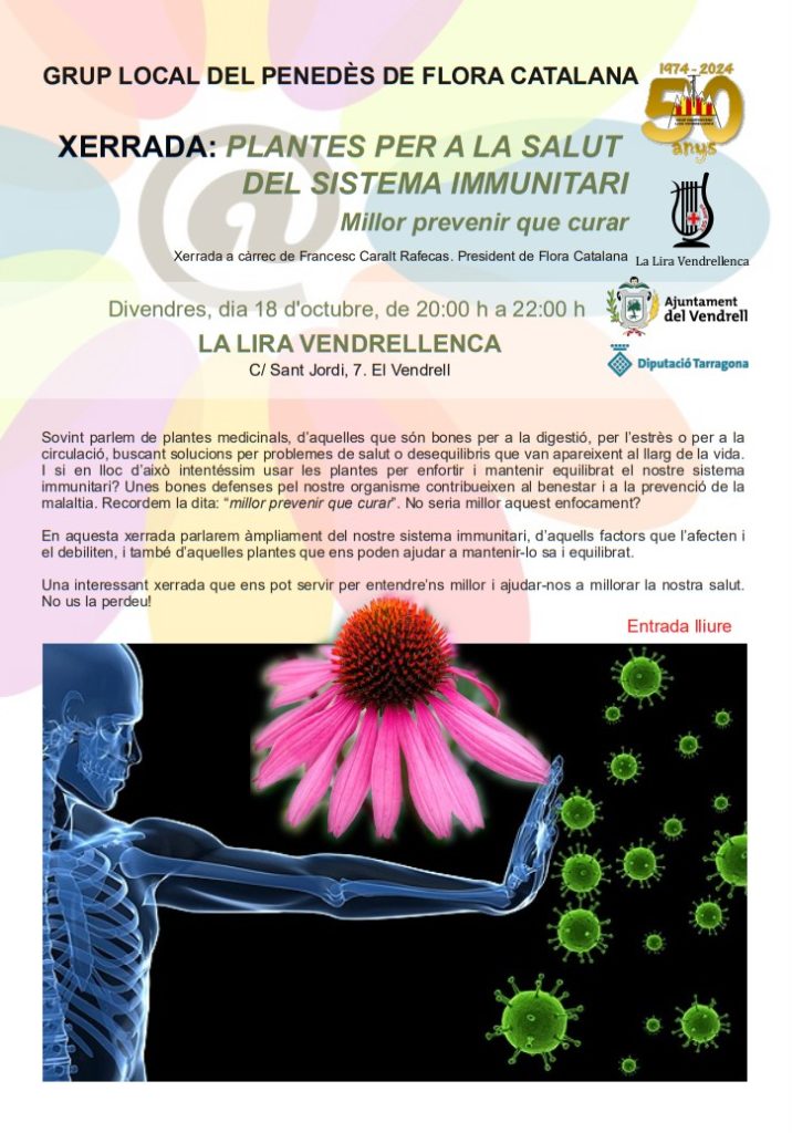 En aquesta xerrada que tindrà lloc a la La Lira Vendrellenca (Carrer Sant jordi, 7. El Vendrell), el divendres dia 18 d’octubre de, 20:00 h a 22:00 h, parlarem àmpliament del nostre sistema immunitari, d’aquells factors que l’afecten i el debiliten, i també d’aquelles plantes que ens poden ajudar a mantenir-lo sa i equilibrat. La xerrada és a càrrec de Francesc Caralt Rafecas (president de Flora Catalana).