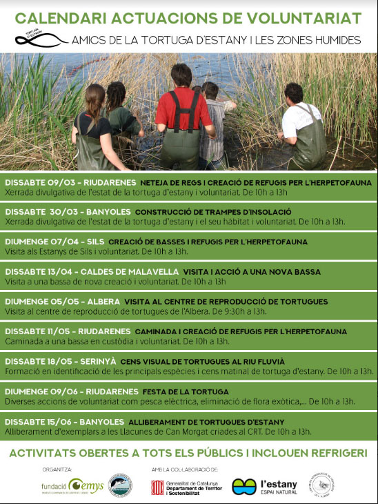 Es podrà conèixer l’estat de la tortuga d’estany, les característiques de l’espècie, el seu hàbitat i com millorar-lo, de la mà de les formacions prèvies a les actuacions de voluntariat. Aquestes seran, per exemple, la neteja de recs, la creació d’una bassa temporal, l’observació i monitoratge de tortuges o la creació de refugis per herpetofauna (amfibis i rèptils).