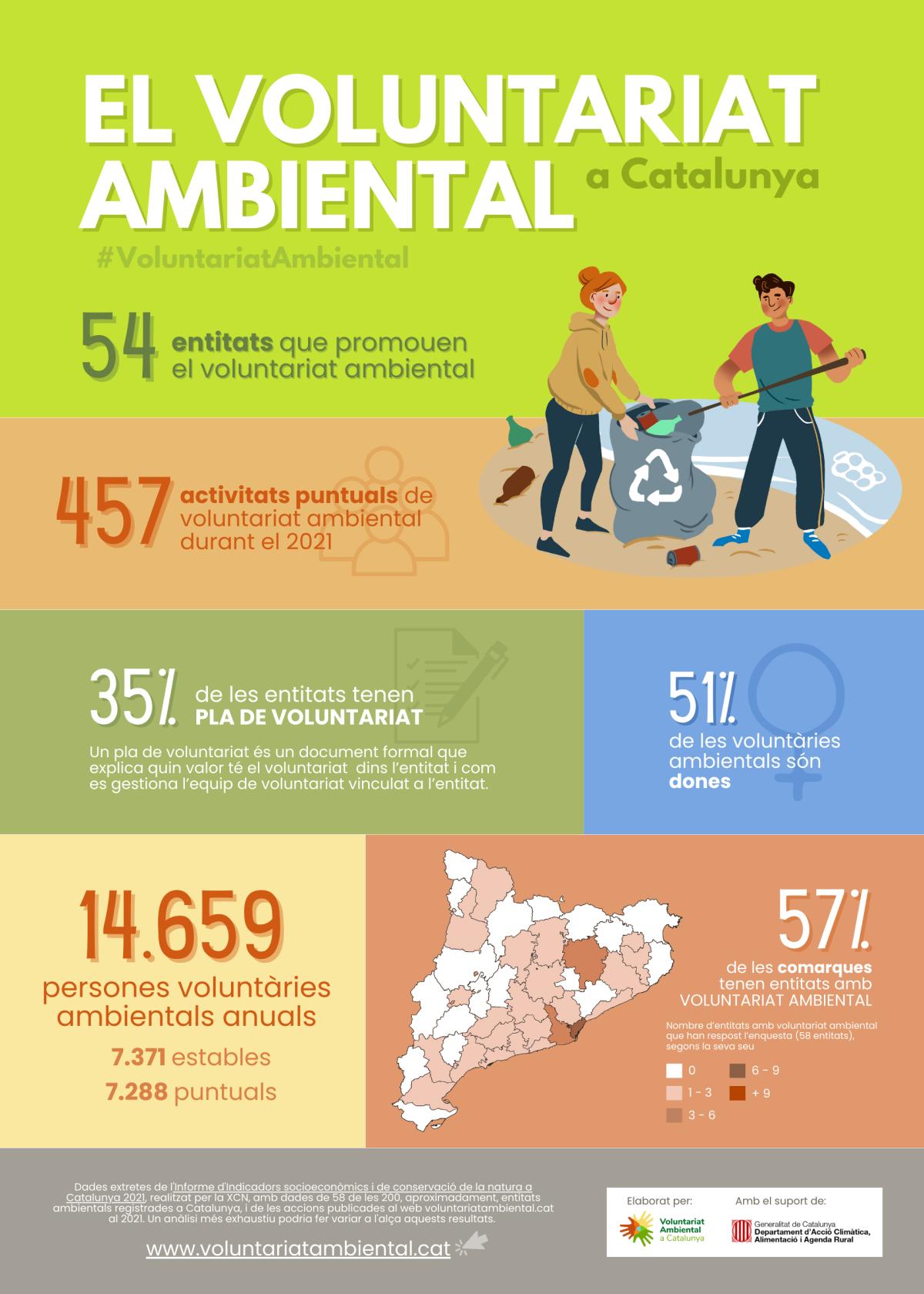 L’informe analitza 58 entitats, 54 de les quals promou el voluntariat ambiental com a eina d’implicació ciutadana. Al 2021 es van implicar fins a 14.659 persones voluntàries ambientals, d’aquestes, aproximadament el 50% de forma estable durant l’any, i el 50% de forma puntual a través d’activitats d’un dia. En total, es van organitzar fins a 457 activitats de voluntariat ambiental d’un dia, registrades al portal voluntariatambiental.cat