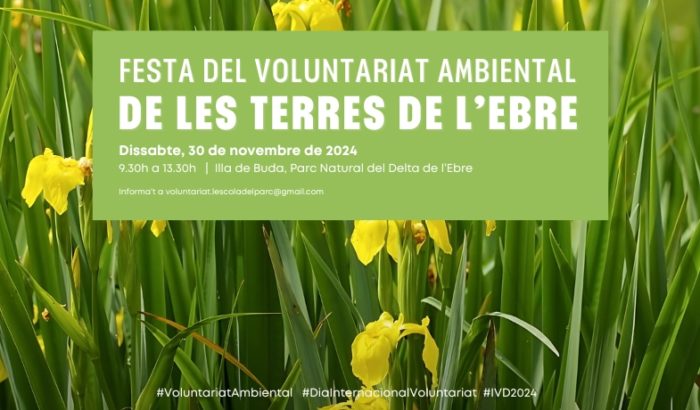 Festa del Voluntariat Ambiental 2024 – Terres de l’Ebre: plantada de lliri groc i alliberament de samarucs dissabte 30 de novembre 2024 Illa de Buda Voluntariat als espais naturals protegits Voluntariat Parc Natural del Delta de l'Ebre Entitat: Associació de Voluntaris del Parc Natural del Delta de l'Ebre Plantada de lliri groc dissabte 26 d’octubre 2024 Parc Natural del Detta de l'Ebre Voluntariat Parc Natural del Delta de l'Ebre Entitat: Associació de Voluntaris del Parc Natural del Delta de l'Ebre Recollida de residus a l’aiguamoll de l’Illa de Mar dissabte 1 de juny 2024 Deltebre Voluntariat als espais naturals protegits Voluntariat Parc Natural del Delta de l'Ebre Entitat: Associació de Voluntaris del Parc Natural del Delta de l'Ebre Mostreig de brossa marina a la platja dels Eucaliptus dissabte 11 de maig 2024 Amposta Voluntariat als espais naturals protegits Voluntariat Parc Natural del Delta de l'Ebre Entitat: Associació de Voluntaris del Parc Natural del Delta de l'Ebre Per un Delta Net! diumenge 10 de març 2024 Camarles, Amposta, La Ràpita, Sant Jaume d'Enveja, Deltebre Voluntariat als espais naturals protegits Parc Natural del Delta de l'Ebre Entitat: Associació de Voluntaris del Parc Natural del Delta de l'Ebre Eliminació de carpobrotus al Fangar dissabte 11 de novembre 2023 Deltebre Voluntariat als espais naturals protegits Voluntariat Parc Natural del Delta de l'Ebre Entitat: Associació de Voluntaris del Parc Natural del Delta de l'Ebre Delta de l’Ebre – Formació: La tortuga babaua s’acosta a les nostres platges, com hem d’actuar? dilluns 24 de juliol 2023 Ecomuseu del Parc Natural del Delta de l'Ebre Voluntariat als espais naturals protegits Formació Parc Natural del Delta de l'Ebre Entitat: Associació de Voluntaris del Parc Natural del Delta de l'Ebre Participa en la vigilància del niu de tortuga careta al Delta de l’Ebre! dilluns 24 de juliol - dilluns 14 d’agost 2023 Parc Natural del Delta de l'Ebre Voluntariat als espais naturals protegits Voluntariat Entitat: Associació de Voluntaris del Parc Natural del Delta de l'Ebre Tothom Per un Delta net! Retirada de residus del Delta de l’Ebre diumenge 12 de març 2023 L'Ampolla, Amposta, La Rapita, Sant Jaume d'Enveja, Els Muntells, Deltebre Voluntariat Parc Natural del Delta de l'Ebre Entitat: Associació de Voluntaris del Parc Natural del Delta de l'Ebre Tothom Eliminació de Carpobrotus edulis (ungla de gat) dissabte 25 de febrer 2023 Parc Natural del Delta de l'Ebre Voluntariat als espais naturals protegits Voluntariat Parc Natural del Delta de l'Ebre Entitat: Associació de Voluntaris del Parc Natural del Delta de l'Ebre Tothom Sortida pardalera al Delta de l’Ebre diumenge 1 de maig 2022 L'Ampolla Voluntariat als espais naturals protegits Formació Voluntariat Parc Natural del Delta de l'Ebre Entitat: Associació de Voluntaris del Parc Natural del Delta de l'Ebre Eliminació de carpobrotus al Garxal diumenge 12 de desembre 2021 Deltebre Voluntariat als espais naturals protegits Voluntariat Parc Natural del Delta de l'Ebre Entitat: Associació de Voluntaris del Parc Natural del Delta de l'Ebre Tothom Projecte Pinna: seguiment de nacres al Trabucador divendres 24 de setembre 2021 Sant Carles de La Ràpita Voluntariat als espais naturals protegits Formació Voluntariat Parc Natural del Delta de l'Ebre Entitat: Associació de Voluntaris del Parc Natural del Delta de l'Ebre Tothom Neteja solidària a la platja del Desaigüe de la Maquineta a La Ràpita diumenge 16 de febrer 2020 La Ràpita Entitat: Associació de Voluntaris del Parc Natural del Delta de l'Ebre Tothom Acció per protegir les nacres del Delta de l’Ebre, pel Dia Mundial de les Zones Humides diumenge 2 de febrer 2020 Poble Nou del Delta Entitat: Associació de Voluntaris del Parc Natural del Delta de l'Ebre Acció de neteja a la platja dels Eucaliptus al Delta de l’Ebre dissabte 1 de febrer 2020 Amposta Entitat: Associació de Voluntaris del Parc Natural del Delta de l'Ebre Tothom Per un Delta Net! diumenge 10 de març 2019 Delta de l'Ebre Entitat: Associació de Voluntaris del Parc Natural del Delta de l'Ebre